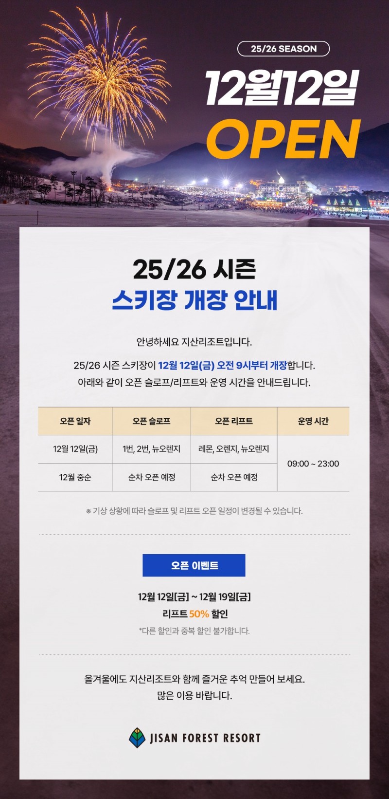2526 지산리조트 오픈 안내 입니다. 오픈행사로 12월 12일부터 12월 19일까지 리프트 50% 할인 합니다.