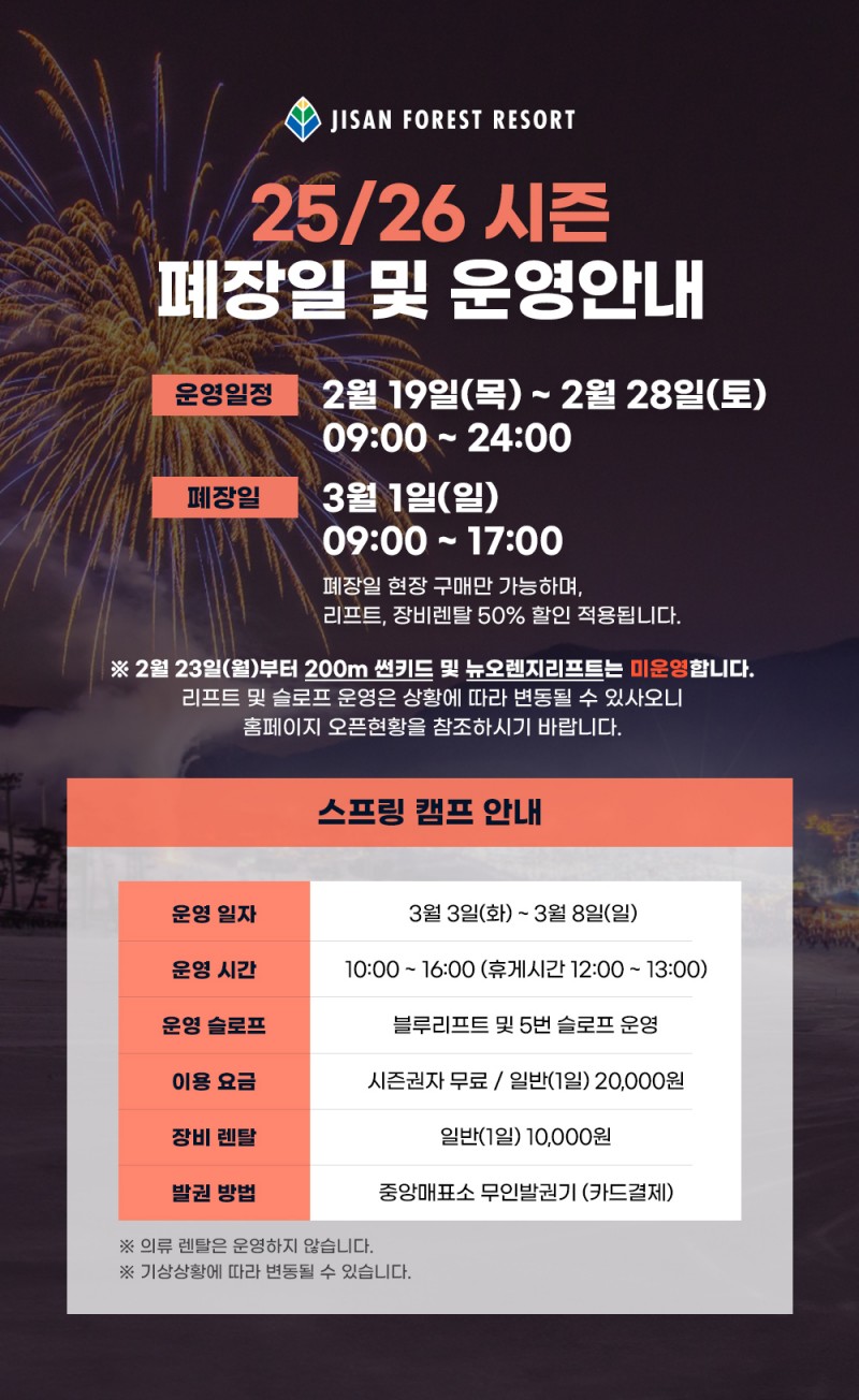 26년 지산리조트 폐장 안내 입니다