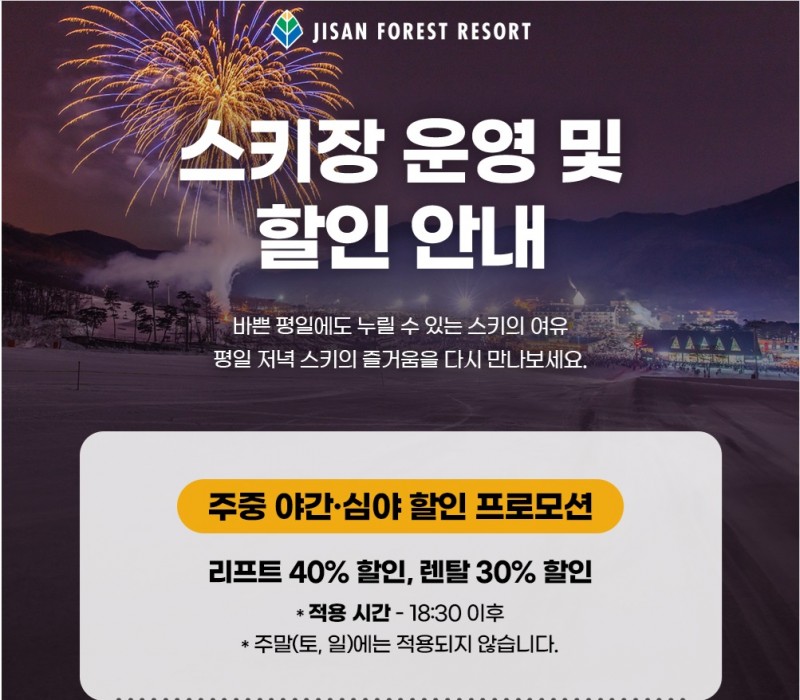 지산리조트에서 별도에 공지 없는 한 평일 주간 야간 리프트할인 40%가 됩니다.!