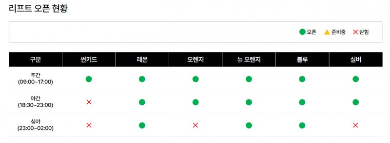리프트는 주간시간에는 모든 리프트가 개방될 예정이며, 야간에는 "썬키드"를 제외한 모든 리프트가 운영될 예정입니다.