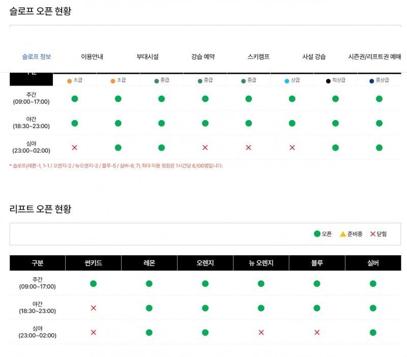 금일 주간에는 모든 슬로프가 개방될 예정이며, 야간과 심야에는 주간보다 단축되어 개방될 예정입니다.