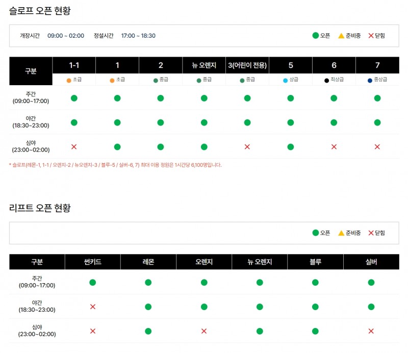 금일 주간에는 모든 슬로프가 개방될 예정이며, 심야에는 주간과 야간보다 단축되어 개방될 예정입니다.