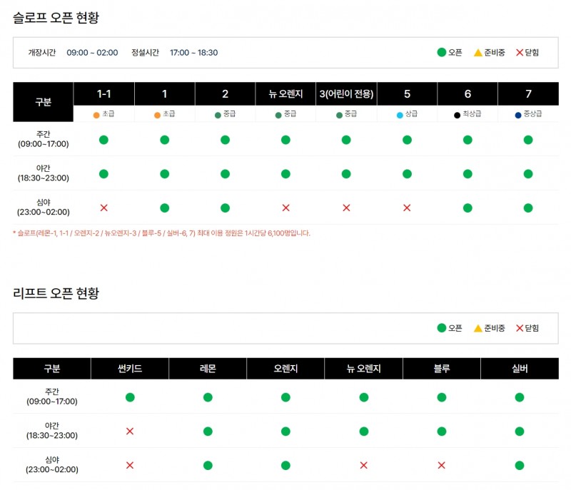 금일 주간에는 모든 슬로프가 개방될 예정이며, 야간과 심야에는 주간보다 단축되어 개방될 예정입니다.