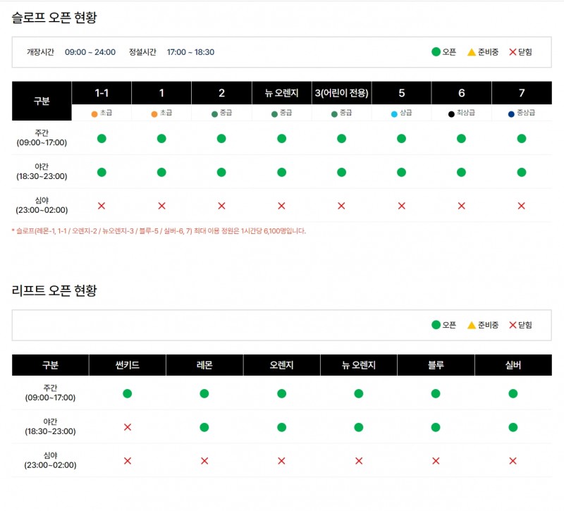 금일 주간과 야간에는 모든 슬로프가 개방될 예정입니다.