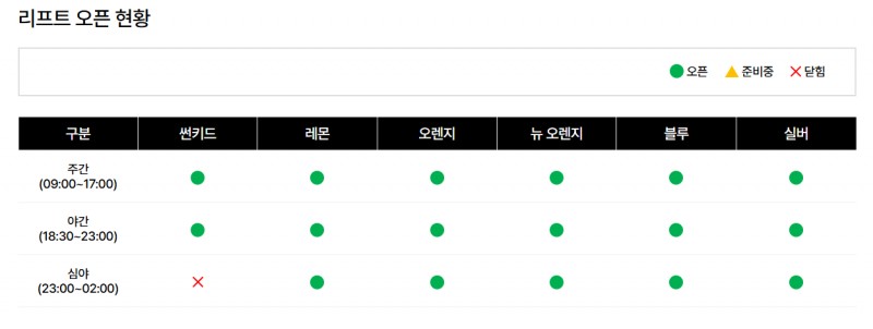 리프트는 야간까지는 모든 곳이 개방될 예정이며, 심야시간에도 썬키드를 제외한 모든 곳이 개방될 예정입니다.