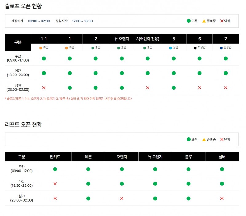 금일 주간에는 모든 슬로프가 개방될 예정이며, 심야에는 주간과 야간보다 단축되어 개방될 예정입니다.